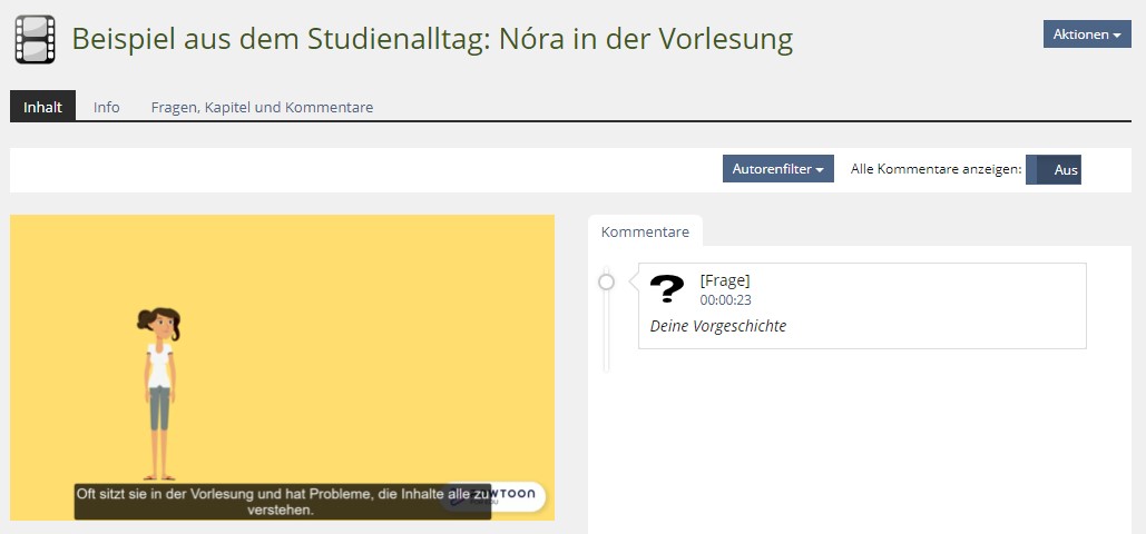 - (Öffentliche) Kommentarfunktion: Während des Videos können Kommentare hinterlegt werden, die entsprechend dem Zeitstempel den anderen Teilnehmenden erst zum korrekten Fortschritt des Videos angezeigt werden.